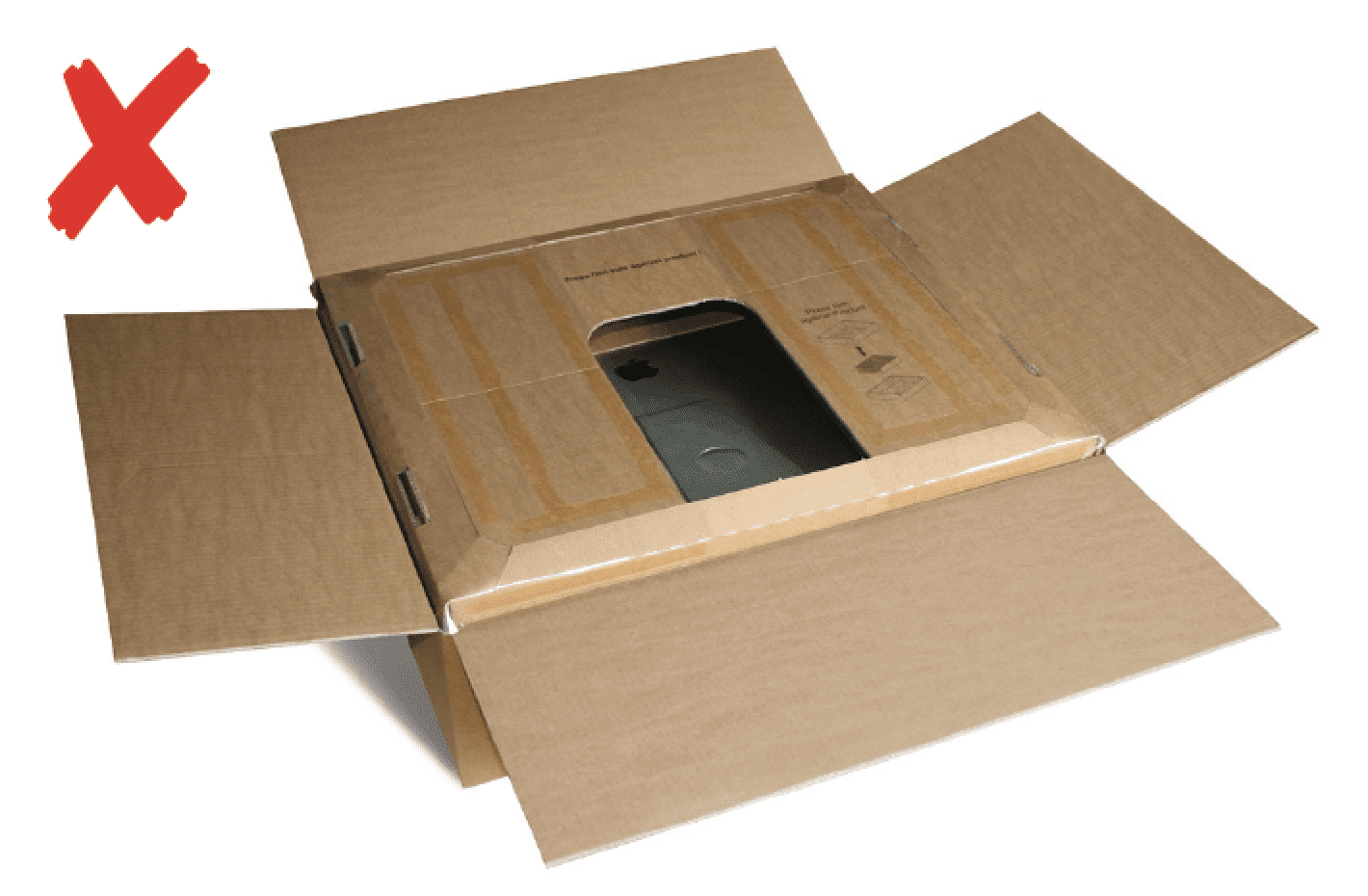 - Plaats de iMac voorzichtig met het scherm naar beneden in de doos. Als het goed is zie je nu ook de tekst niet meer.